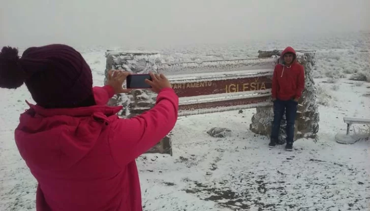 El inusual fenómeno atrajo a turistas que llegaron hasta Iglesia para disfrutar de la nieve y vivir una primavera distinta.