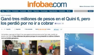 Por ese motivo la noticia del sanjuanino que perdió esa cantidad de dinero por no presentarse a cobrar la boleta del Quini 6 que podía hacerlo millonario recorre los medios de todo el país. Nadie puede creerlo, para todos resulta insólito.