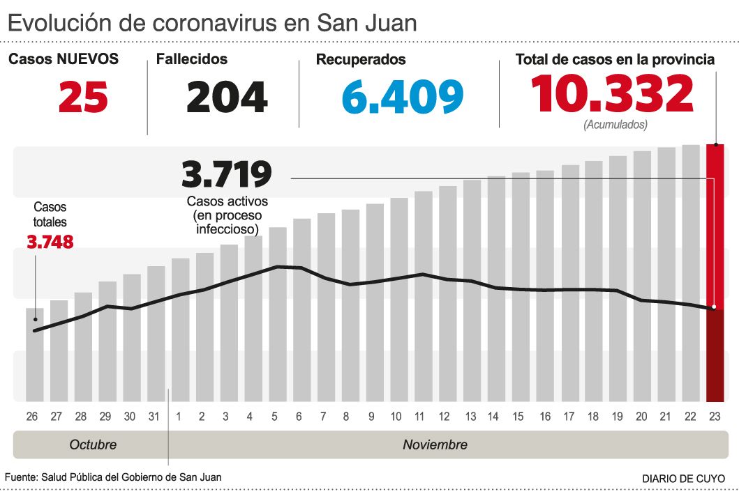 Por su parte, ayer fue reportado un nuevo deceso por Covid, un hombre de 80 años, por lo que los fallecidos suman 204; en tanto que con apenas 25 casos detectados ayer (el más bajo en más de un mes), el total es de 10.332. Actualmente hay más de 210 internados, de los cuales 108 permanecen en diferentes terapias intensivas (de los subsectores público y privado). Si bien dotaron de infraestructura crítica al CEMEC (12 camas) y al Marcial Quiroga (13), el centro de salud público que más tiene es el hospital Rawson, con 56; y la posibilidad ahora de duplicarlas. ¿Cómo piensan hacerlo? De las 24 camas de terapia intensiva que tenía el Rawson hasta el mes pasado, en el ala Oeste del tercer piso sumaron 12 ya operativas y el cupo se amplió con otras 20, en el mismo sector.