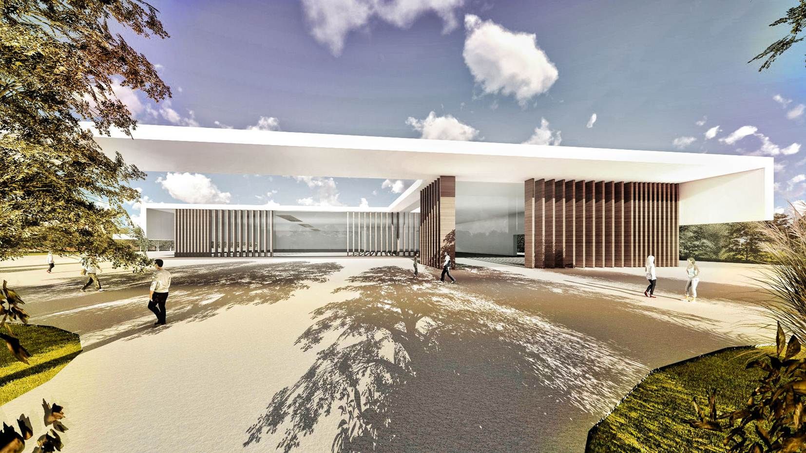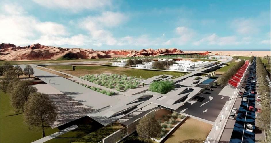 A todo motor. Avanzan las tareas de cierre perimetral de las 37 hectáreas que integran el predio ferial localizado en el departamento Chimbas. En la imagen proyectada se ve cómo quedará el acceso.