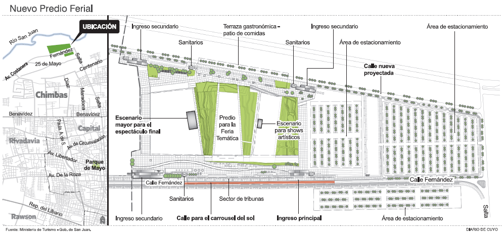 El nuevo espacio se llamará Predio Ferial Costanera del Sol y tendrá una superficie de 37 hectáreas. En su interior se diseñó un estacionamiento que podrá albergar unos 4.000 vehículos. "La primera etapa a su vez, contempla otras instancias: movimiento de suelo (ya finalizada), el cierre perimetral y la construcción del sector de la feria abierta", indicó Deiana. Y agregó: "Más adelante se construirá un anfiteatro con capacidad para 15 mil personas y por último, el predio cubierto". A su vez, como adelantó recientemente el intendente Fabián Gramajo, se prevé la construcción de un corsódromo que esperan estrenar para los próximos carnavales. Aunque es casi seguro que ese lugar se ocupe antes con el Carrusel del Sol porque ya no se realizará por avenida Ignacio de la Roza, como se hizo siempre.