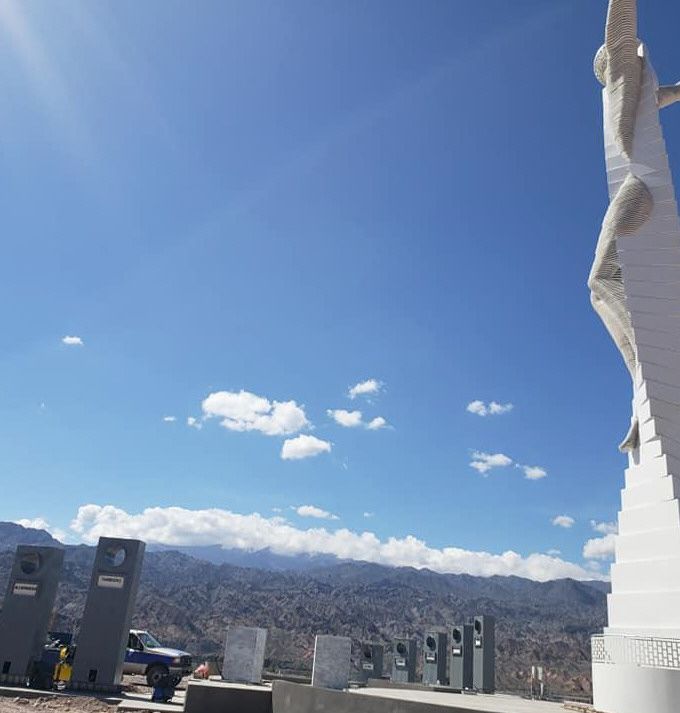 Para que el pretendido ícono del turismo religioso en Calingasta esté completo, resta todavía agregar una pieza más a la obra, que es la cruz de 26 metros, emplazada detrás de la figura principal, para simbolizar su desprendimiento y su ascenso al cielo.