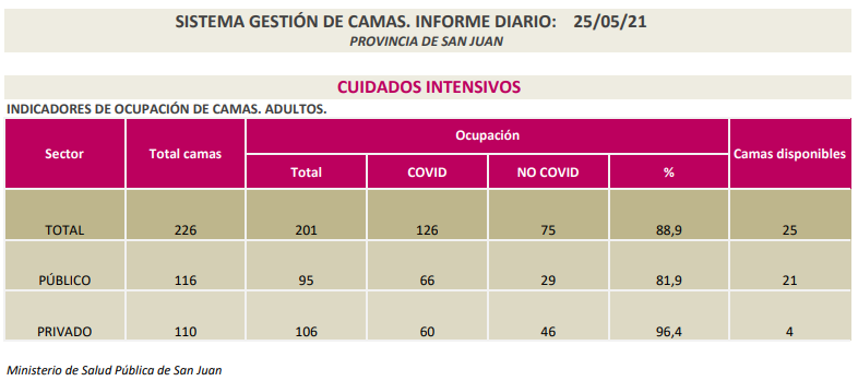 Además, se encuentran internados 280 pacientes en las áreas de COVID-19 (entre positivos y sospechosos) de los hospitales Dr. Guillermo Rawson; Dr. Marcial Quiroga; Dr. Ventura Lloveras, de Sarmiento; Dr. César Aguilar, de Caucete; Dr. José Giordano, de Albardón; Dr. Federico Cantoni, de Pocito; CEMEC; Dra. Julieta Lanteri; Hospital San Roque, de Jáchal; Hospital Dr. Alejandro Albarracín, de Valle Fértil; Hospital de Barreal, de Calingasta; Hospital Privado; Instituto Médico; Clínica El Castaño; Clínica Santa Clara; Sanatorio San Juan y CCI.