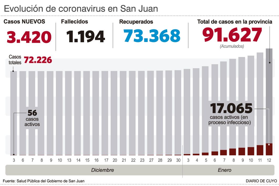 A tono con la tendencia mundial, con la que (según datos de la ONU) sólo en la última semana aumentaron 50% los contagios de coronavirus debido sobre todo a la presencia de Ómicron, ayer el informe oficial sobre la pandemia en San Juan fue lapidario. En una sola jornada, Salud Pública registró más de 3.400 contagios, algo que no había sucedido nunca desde la llegada del virus a la provincia. De esta manera el total acumulado de casos supera holgadamente los noventa mil a nivel local.