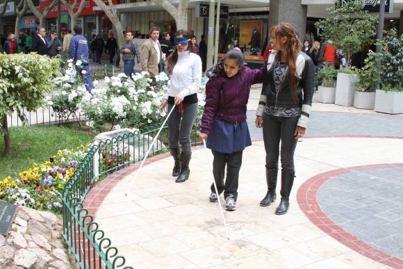 Previa explicación de la profesora Adriana Quiroga (de la escuela Luis Braille) sobre la denominada Técnica de Rastreo, me pusieron un antifaz, me dieron el clásico bastón blanco y me lancé a la difícil aventura de convertirme en una no vidente por unos minutos en el corazón de la ciudad. Arranqué despacio en el cruce de las peatonales, y en cada paso meditaba concentrada qué era lo que debía hacer a continuación. A mi primer movimiento con la pierna derecha, debía mover el bastón hacia la izquierda; al siguiente paso con la pierna izquierda, el bastón tenía que ir hacia el lado contrario. En unos pocos metros ya había logrado un mínimo de coordinación. Así, lo que parecía ser una tarea imposible se convirtió en posible. Pero muy difícil.
