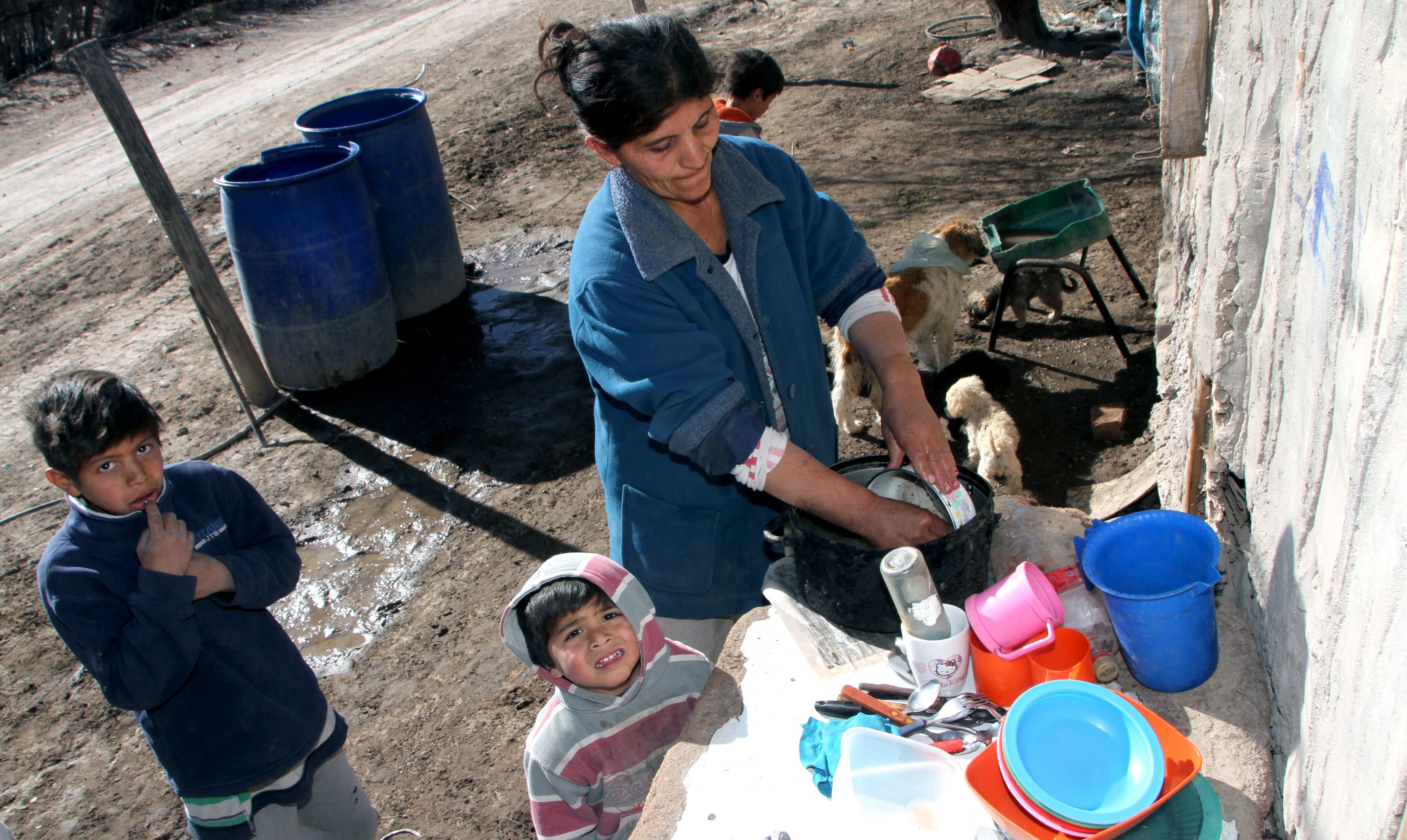 Liliana Ahumada tiene 8 hijos. Se las ingenia con dos tachos de agua para poder hacer todas las tareas de la casa. "Hay días que los chicos no tienen ropa para ponerse porque se me acumulan las prendas sucias, por falta de agua. Preferimos que quede agua para tomar y para cocinar", dijo la mujer.
