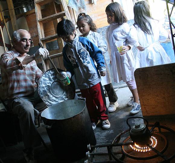 En fila india y frente a la puerta del baño que improvisaron en un depósito de agua, los alumnos de la salita de 4 y de 5 esperaron que su seño les echara una gotita de jabón liquido, sin derrochar, para lavarse bien las manos. Aprendieron que deben hacerlo antes de comer para no contaminar la comida. Un poco más allá, don César trató de espantar con ramas de pimiento las moscas que revoloteaban alrededor de las jarras con leche caliente que colocó en una mesa al aire libre porque en el depósito de chapas, y con mucha suerte, sólo caben él y el quemador donde la calienta. Luego se puso los guantes de látex para servir el desayuno.