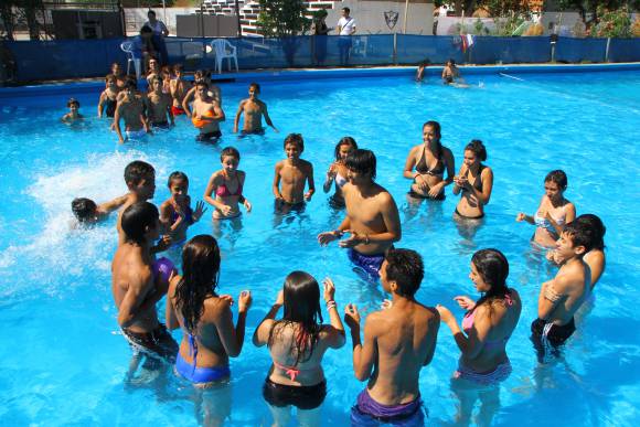 La mayoría se tiró al agua al mismo tiempo para aprovechar al máximo las horas de actividades en la pileta. Como se chocaban unos con otros, los coordinadores decidieron dividirla en sectores para que todos pudieran disfrutar del lugar con comodidad. Una mitad la destinaron como sector de juegos donde los chicos demostraron su resistencia y habilidad, tirando de la soga o en competencias de nado con posta, entre otras actividades. Otro espacio fue para quienes sólo prefirieron nadar y hacer piruetas, y otro, para quienes no sabían nadar y que se conformaron con meterse al agua para refrescarse.