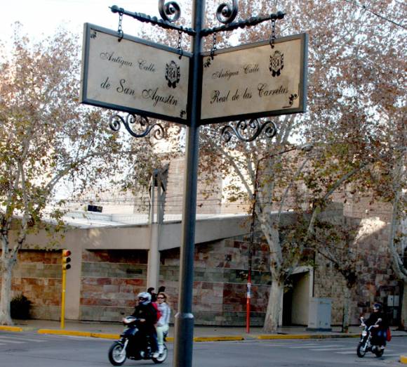 A pocos centímetros de los clásicos carteles azules con el nombre actual de las calles están las nuevas columnas, con sus colgantes decorados y letra cursiva, que indican cómo se llamaban esas arterias durante la colonia en San Juan: la Mendoza era la Calle Real de las Carretas, la Mitre era la Calle de San Agustín, la General Acha era la Calle del Cabildo y la Rivadavia era la Calle del Portón.