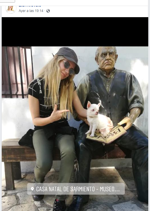 Ayer, la sanjuanina compartió una fotografía en su cuenta de Facebook que genera polémica. En ella se la ve al lado de la escultura de Domingo Faustino Sarmiento ubicada al lado de la puerta de ingreso a la Casa Natal del prócer, con su perro sentado sobre el libro que sostiene la imagen.