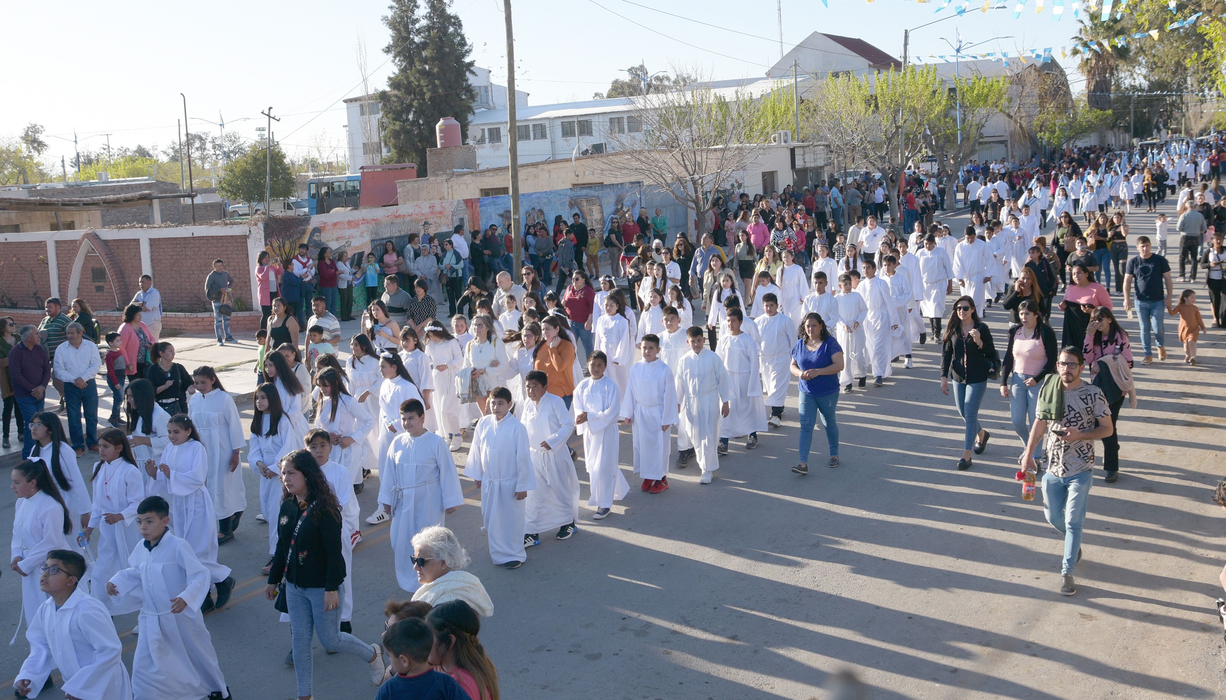 La procesión demoró en arrancar porque se asignaron lugares para mantener el orden. Es que este año participaron todas las escuelas del departamento, las academias de baile, las comunidades parroquiales de todas las localidades veinticinqueñas como también de Albardón, Caucete y Sarmiento. Y a esta multitud se sumaron los devotos que llegaron desde Mendoza, Córdoba, Catamarca, San Luis y Santa Fe, por primera vez y aprovechando que este año las Patronales se realizaron un día domingo.