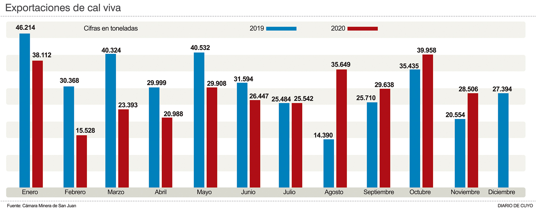 Para el retroceso en la actividad tuvieron que ver dos factores. Primero que la industria estuvo paralizada casi durante 20 días en marzo y después la actividad comenzó a regresar en forma paulatina. La otra razón fue que durante el invierno pasado hubo muchos cortes por las intensas nevadas en la cordillera, que impidieron que los camiones pudieran cruzar hacia Chile por el Paso de Cristo Redentor. Es que el 95% de las exportaciones de cal sanjuanina van al vecino país, todo en camiones, mientras que el resto va a Uruguay y algo de producción a Paraguay.