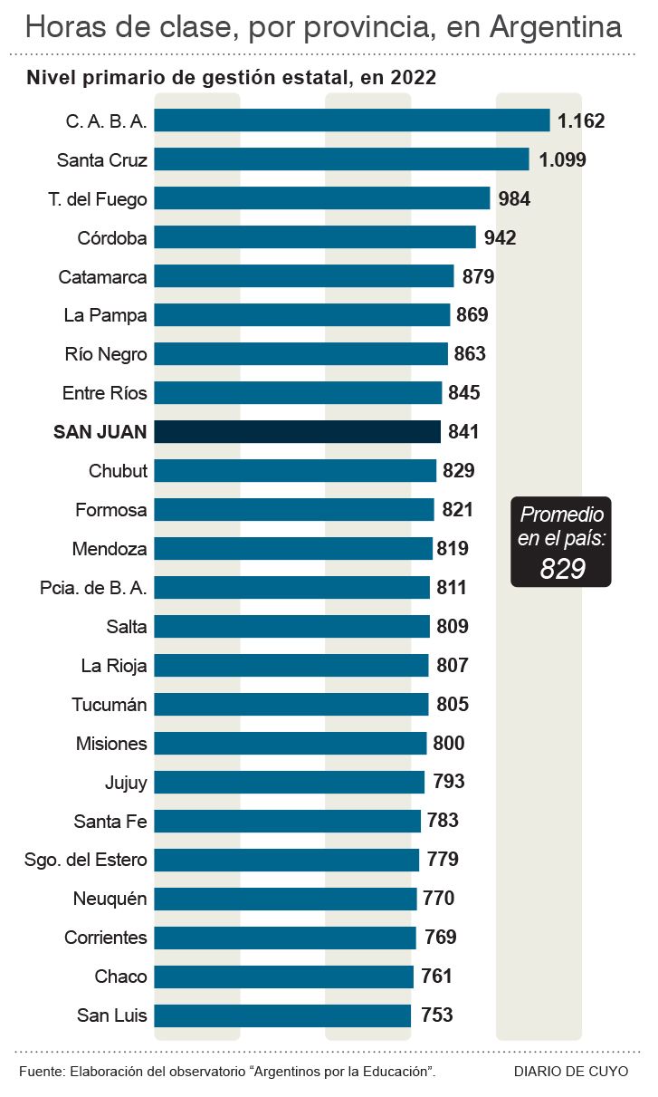 En tanto que, a nivel nacional, San Juan ocupó el noveno lugar dentro de las provincias con mayor cantidad de horas de clases, superando la media nacional registrada en el 2022, que fue de 829 horas anuales, según el informe. Ese número se desprendió de analizar cada jurisdicción, determinando que algunas planificaron más de 1.000 horas de clases en ese entonces, como CABA (1.162) y Santa Cruz (1.099), mientras que otras no superaron las 800.