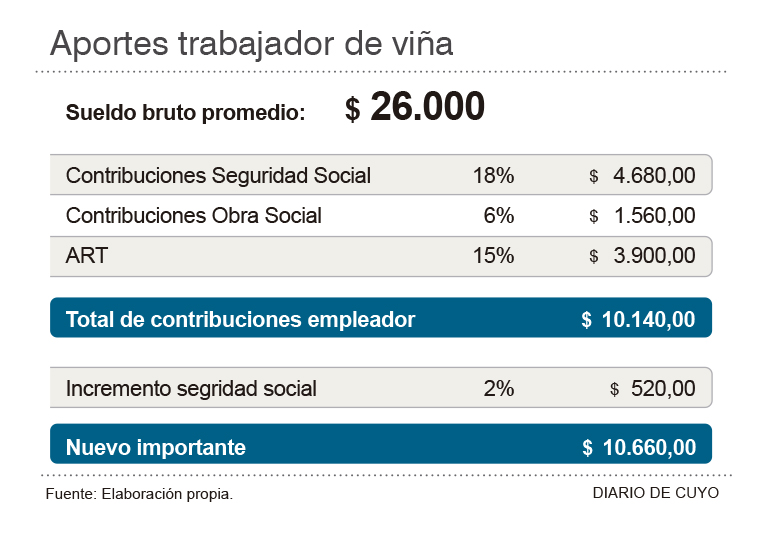 Para entender la modificación se puede considerar que de contribución a la seguridad social por cada trabajador, el viñatero aporta el 18% del sueldo, que en un haber bruto de 26.000 pesos son 4.680 pesos. Al llevarse el aporte al 20%, dos puntos más, el viñatero pagará 520 pesos más.