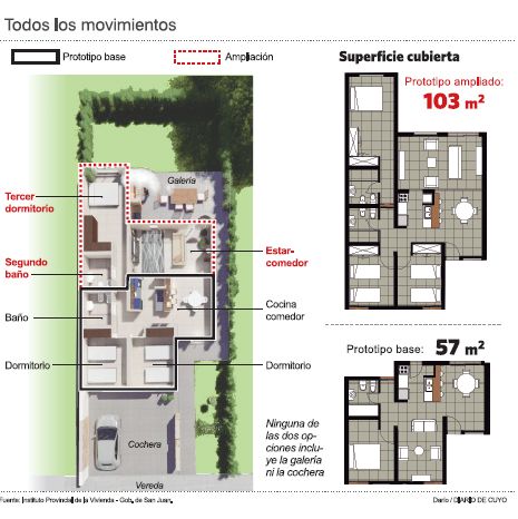 En cuanto al prototipo para zonas urbanas este contará con ampliaciones calculadas, incluidas estructuralmente, lo que brinda la posibilidad de que la gente reciba una vivienda de 57 m2 pero con las herramientas de que a corto plazo pueda convertirla en una de 120 m2, con baño en suite, la posibilidad de un tercer dormitorio con vestidor y, por supuesto, la previsión de una galería que pueda funcionar como cochera para dos autos.