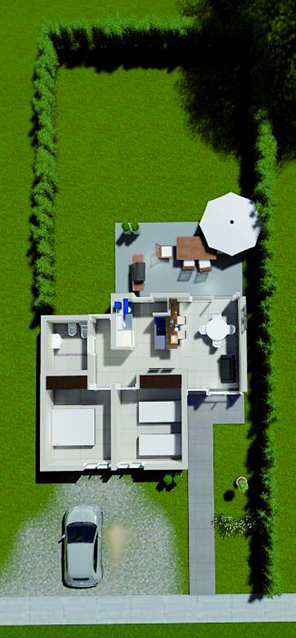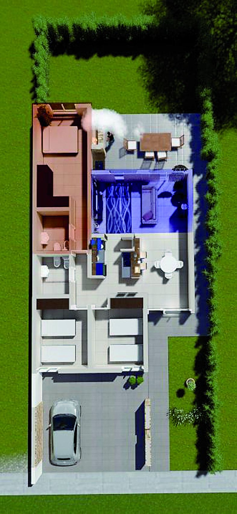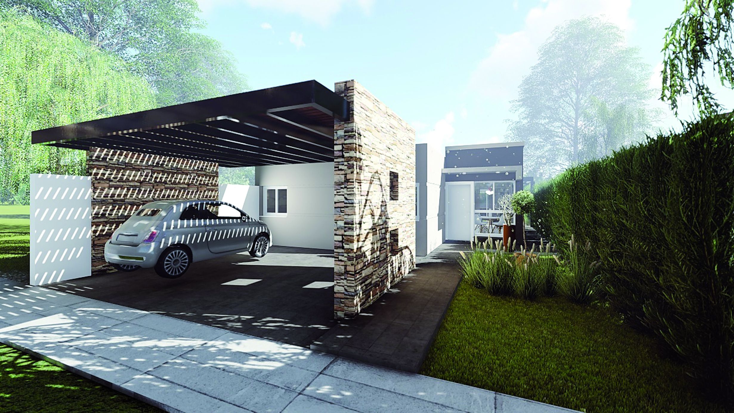 Las maquetas 3D del prototipo de vivienda urbana muestran espacios exteriores con mucho lugar para las cocheras en el frente, así como la presencia de un parrillero en el fondo, un poco más estrecho. Es tan ampliable la construcción que se puede duplicar la cantidad de metros cuadrados cubiertos. La propuesta de decoración para el interior supone iluminaciones tenues, pero a la vez grandes ventanales para la entrada de luz natural.