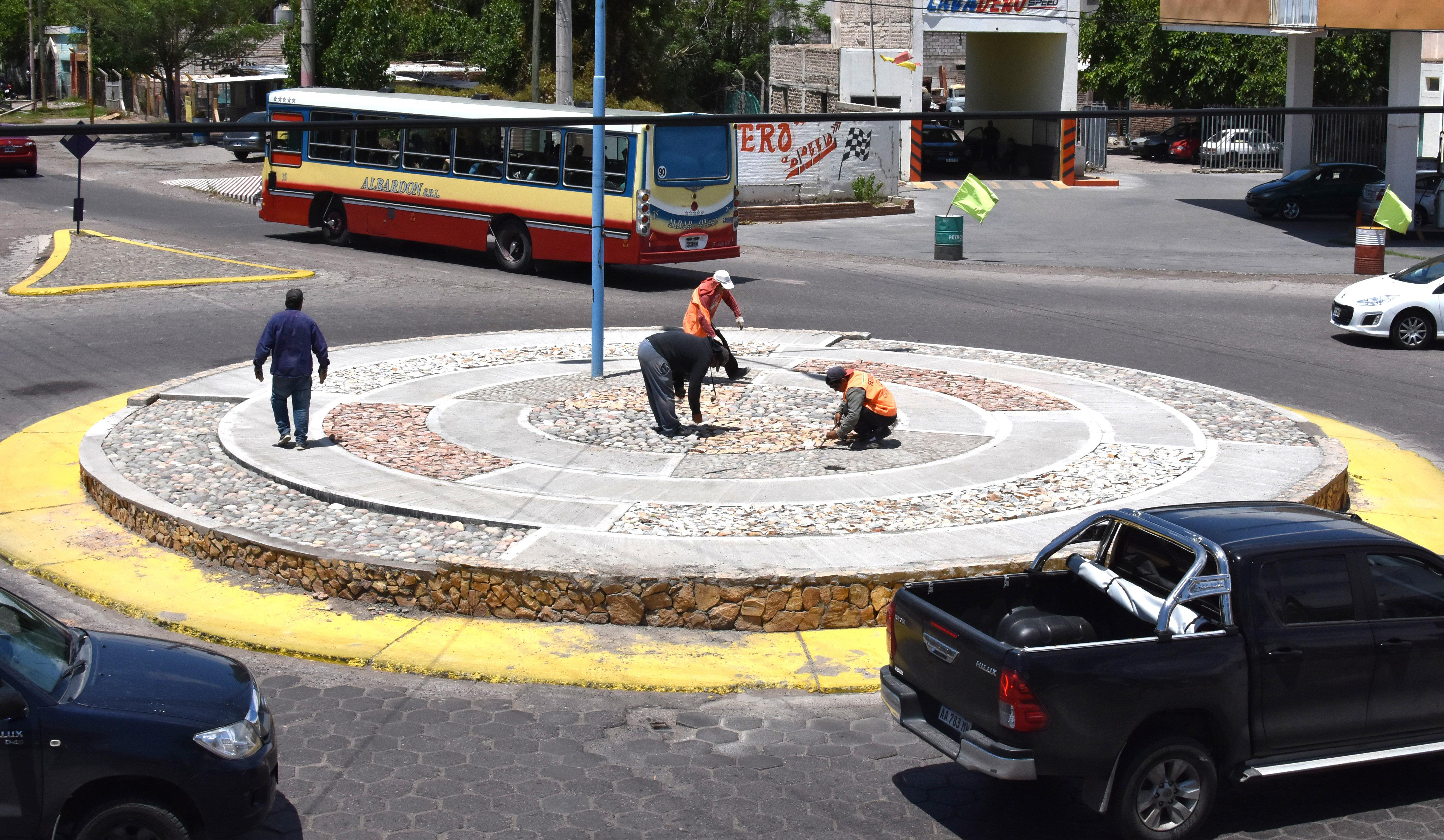Desde lejos se puede apreciar el nuevo diseño de la rotonda que resalta el color y las formas geométricas. Dentro de la superficie de este derivador de tránsito se construyeron cinco círculos de diferentes tamaños y rellenos con hormigón peinado y piedras de diferentes tipos. "Para esta obra no sólo se pensó en el atractivo, sino también en la durabilidad y el mantenimiento. Por eso las circunferencias se hicieron con estructuras metálicas que luego se rellenaron con materiales secos de alta resistencia y de fácil reposición", dijo Fabián Gramajo, intendente de Chimbas.