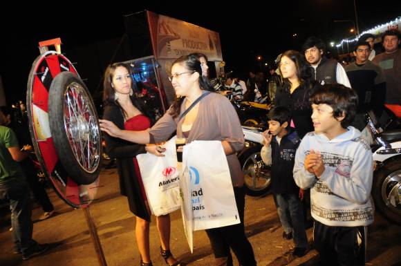 La fila de gente serpenteaba por calle San Luis, pero a sus nuevos eslabones no le importaba la extensión. Iban y se colocaban en el último puesto, que poco duraba porque inmediatamente venía otra persona. El stand de Motos Maverick es uno de los más visitados porque tiene una ruleta que le permite al público jugar con el azar para ganarse un premio. Y como hay más espacios con premio que los que no dan nada, la fila se mueve rápido: un giro a la rueda, cruzar los dedos para que la cintita se frene en un espacio con logo y recibir ahí nomás el regalo de las promotoras, si hubo suerte. Los ganadores se llevan una bolsa con folletería y un llavero y, si aciertan el logo dorado, una traba de seguridad para la moto. Pero, como se puede participar cuantas veces se quiera, hubo muchos perdedores que fueron por revancha. Eso sí, dispuestos a empezar otra vez desde el fondo de la fila.