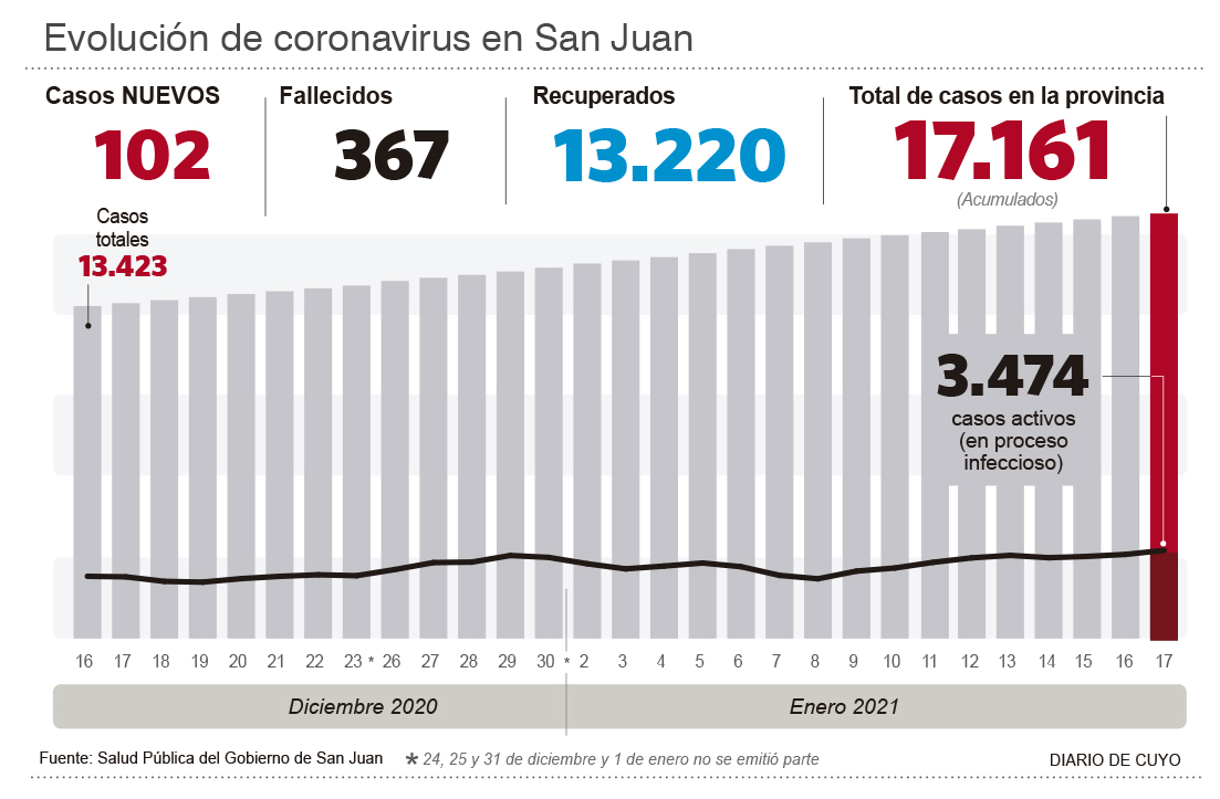 De todos modos San Juan mantiene una muy buena evolución de los casos, con un acumulado total de 17.161, del cual el 77% ya se recuperó del Covid.
