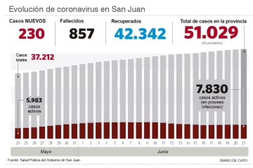 Después de varios días con un índice diario de contagios que fue descripto por las autoridades sanitarias como "una meseta alta", ayer fue informada una cifra relativamente baja de casos de coronavirus en San Juan, siguiendo la aparente tendencia que se inició el último domingo. Según el parte oficial de Salud Pública, ayer hubo 230 contagios registrados, apenas por encima de los 227 informados el día anterior, pero muy por abajo de los más de 430 diarios del sábado hacia atrás.