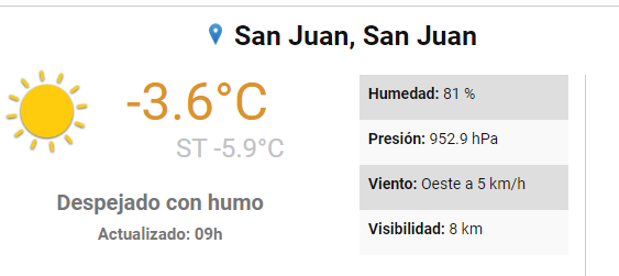 Luego de un domingo caracterizado por la presencia de una espesa neblina y un lunes en el que el termómetro descendió en el Gran San Juan hasta los -6,4 grados, el martes se presentó con una temperatura mínima de -3,6 a las 9 y una sensación térmica de -5,9 grados, según los datos del Servicio Meteorológico Nacional.