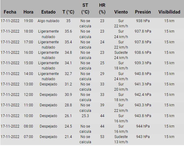 La temperatura creció hasta bien avanzada la tarde en el Gran San Juan de este caluroso jueves. En los registros de la hora 18 que publicó el Servicio Meteorológico Nacional (SMN) se observó la máxima, con 35,6 grados. Y si bien a las 19 ‘descendió’ a los 35 grados redondos, ese registro es superior incluso al de la hora 16, cuando se reportaron 34,8 grados.