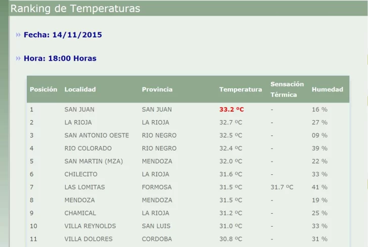 Según el Servicio Meteorológico Nacional, San Juan con 33,2 grados registrado a las 18 es la más calurosa del país superando por muy poco a La Rioja y a San Antonio, en Río Negro que registra 32,5°.