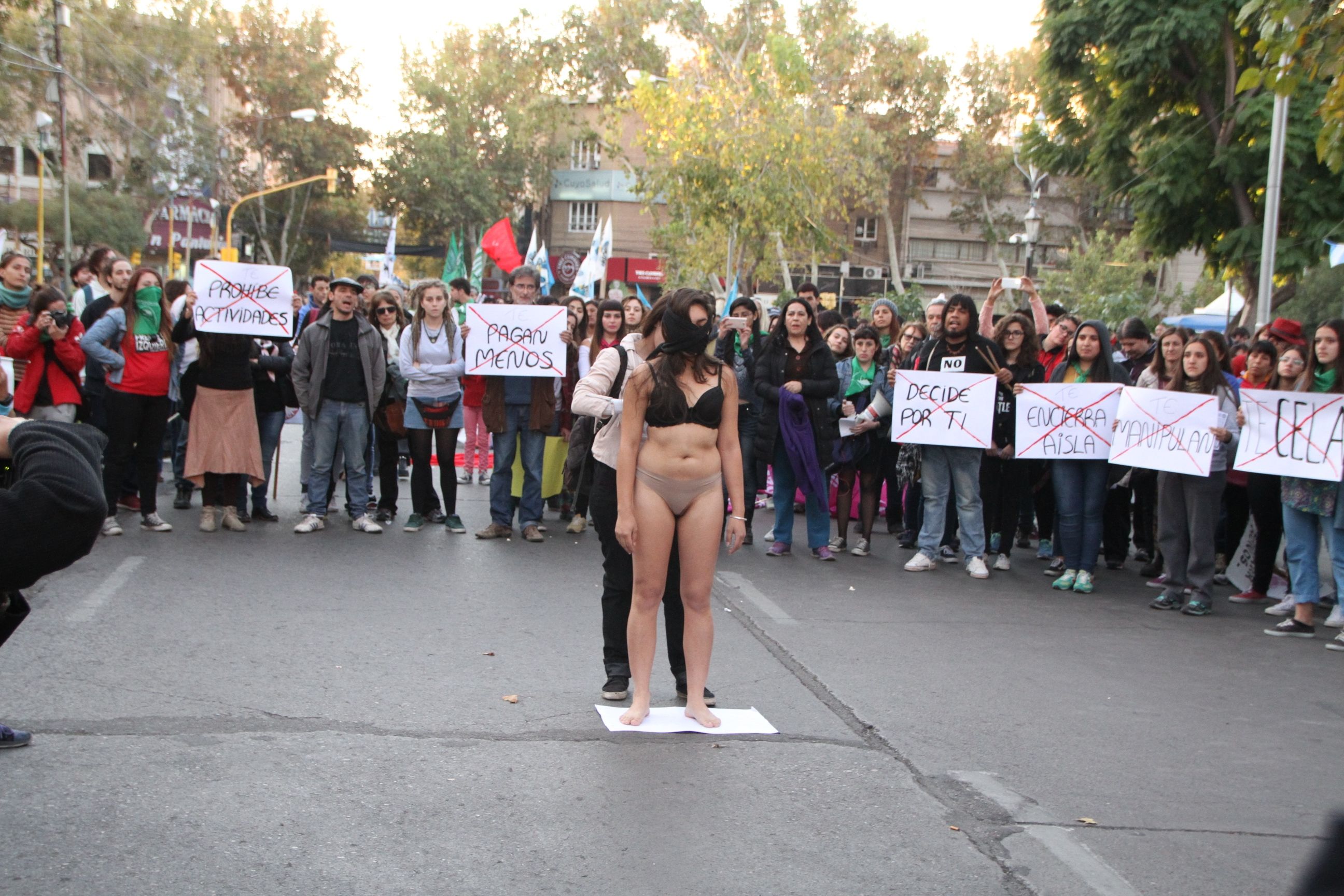 En San Juan también hubo cientos de mujeres que se manifestaron en contra de la violencia de género. Se reunieron en la Plaza 25 de Mayo y marcharon por su perímetro con cánticos y pancartas. Una de las participantes quiso simbolizar a la libertad femenina y se desnudó por completo sobre calle Mendoza, en una actitud que masivamente apoyada por el resto.