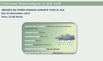San Juan.- Una intensa tormenta eléctrica se hizo presente en la noche de este lunes en la provincia, tal cual lo había adelantado el Servicio Meteorológico Nacional, haciendo descender la temperatura hasta los 20 grados y con la presencia de lluvias en varios sectores de la provincia.
