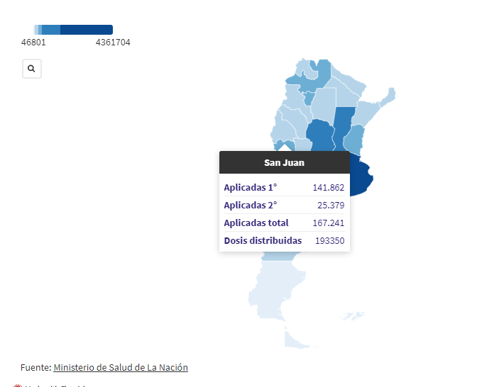 En San Juan, la ministra de Salud, Alejandra Venerando, estimó que "para mediados de junio pensamos tener a toda la población priorizada vacunada con la primera dosis" a un ritmo de "unas 450 vacunas por día".