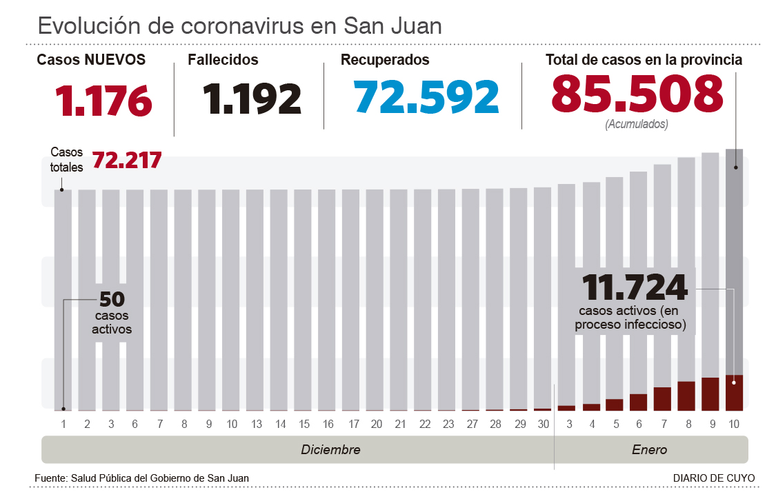 También ayer las autoridades locales confirmaron la circulación viral de Ómicron en San Juan, luego que desde el Instituto Malbrán enviaran los resultados de las muestras sanjuaninas. Si bien fueron detectados dos casos en el conjunto de muestras que mandaron al Malbrán para su análisis, no se puedo establecer nexo epidemiológico entre ellos, de ahí que se declarara la circulación viral, hecho que ya había anticipado DIARIO DE CUYO días atrás.
