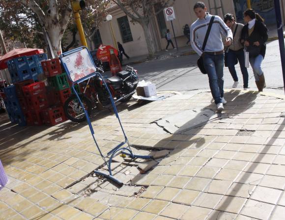 Está en Avenida Rioja y Santa Fe, en Capital, y los comerciantes y transeúntes que pasan habitualmente por allí temen por caídas de peatones o que se derrumbe. "Empezó a hundirse de a poco hace como seis meses y ahora es impresionante. Le tuve que poner un cartel al medio para que la gente se dé cuenta y no se caiga", contó Julio César Rosales, quien trabaja en el quiosco de la esquina.