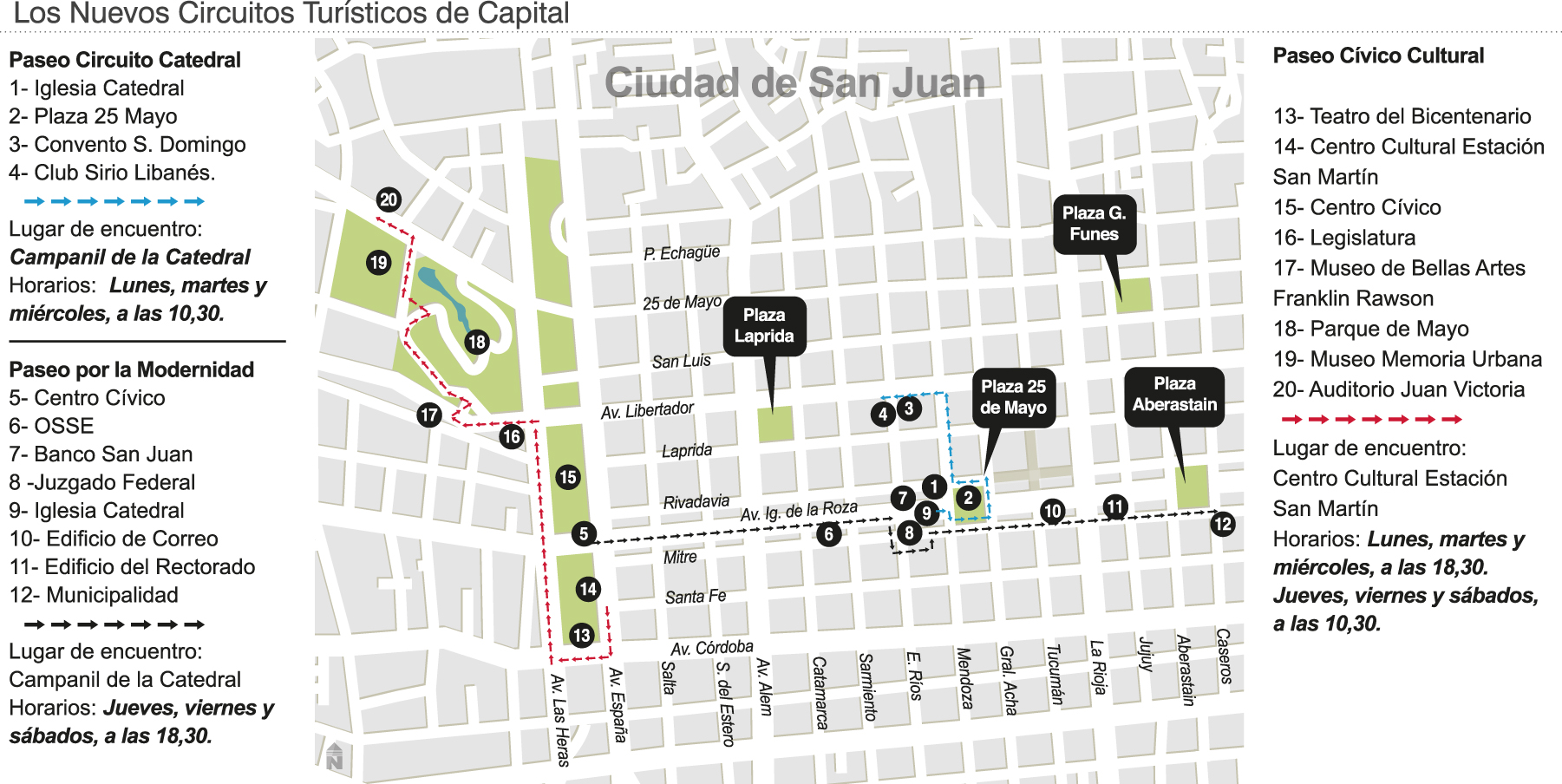 Mostrar el contenido cultural, histórico y turístico, como también la idiosincrasia y la actitud de superación del pueblo sanjuanino, fueron los principales factores que se tuvieron en cuenta para organizar y poner en marcha los tres nuevos circuitos por la ciudad. (Ver aparte).