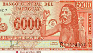 El papel, emula el diseño del billete de cinco mil guaraníes y muestra a la morocha en su máximo esplendor, en aquel retrato que el valió el pasaporte para todas las revistas masculinas.