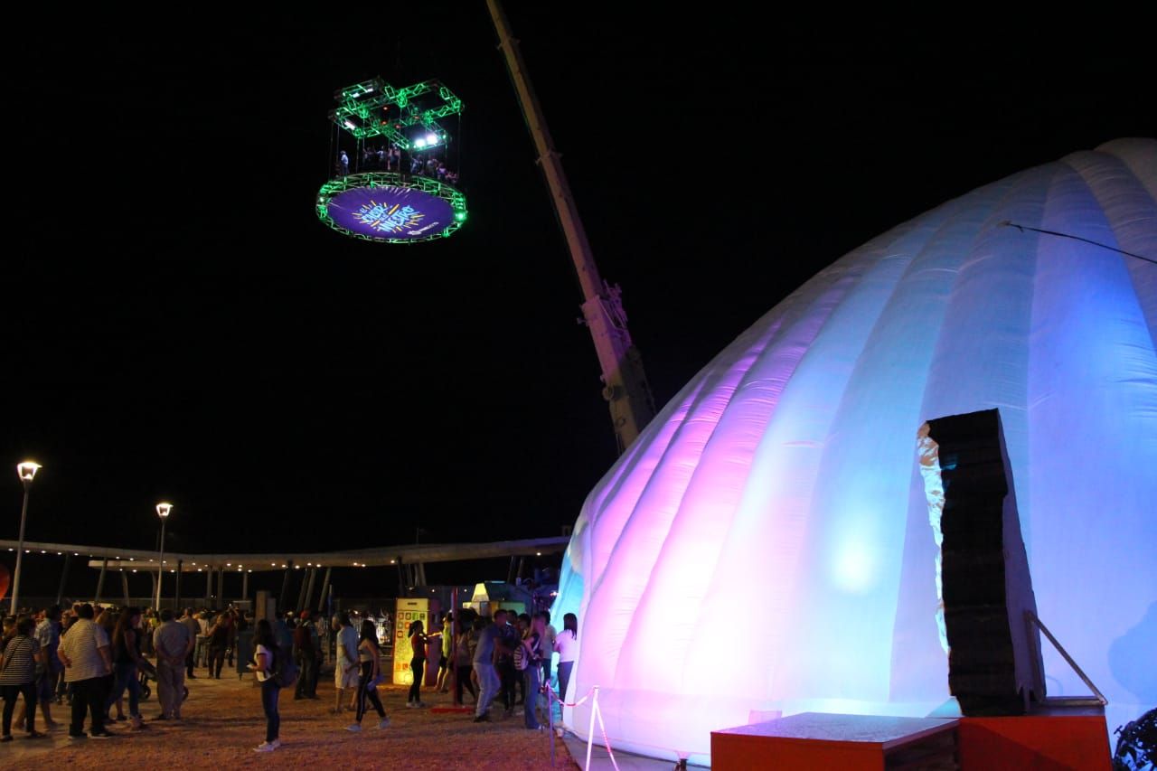 Subieron a una grúa que levanta una plataforma circular a 20 metros del suelo y gira sobre su eje para que los participantes adquieran una visión 360° del predio. Es ideal para sacar fotos y aumentar un poco la adrenalina. Todas las candidatas, quisieron vivir esta experiencia, salvo las postulantes de Jáchal, Rawson y Sarmiento, quienes no se animaron por tener miedo a las alturas.