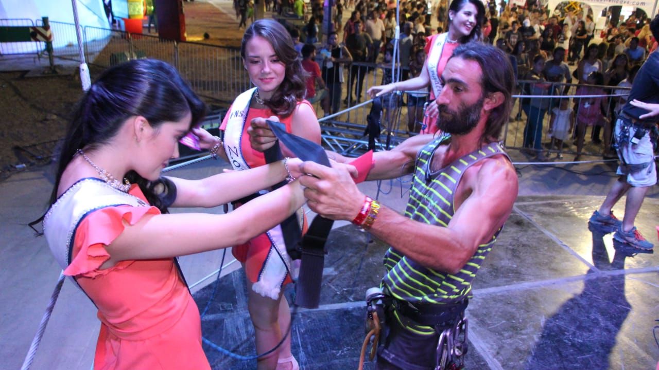 Una a una, las aspirantes a ocupar la corona del Sol fueron subiendo a la plataforma cuidadosamente y se colocaron los arneses de seguridad. Sonrieron, posaron y se divirtieron en la altura.