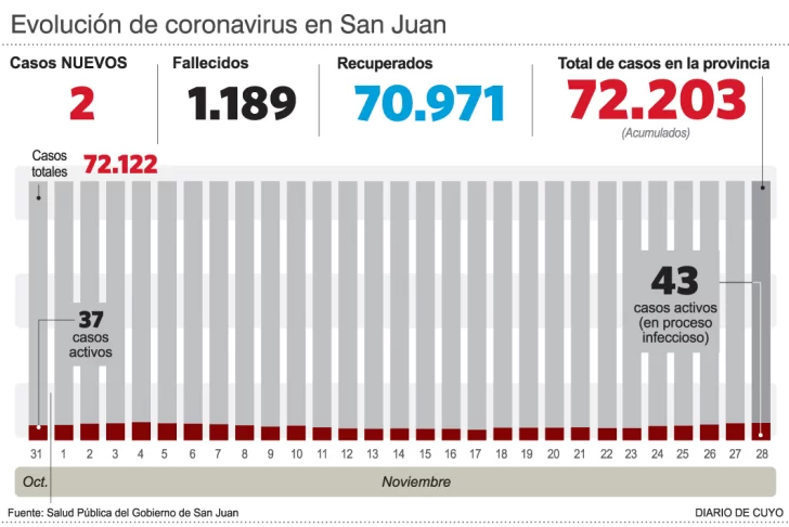 Luego de dos días consecutivos con seis casos cada uno y que durante la semana pasada se haya registrado más positivos por día de los que se venía registrando cada 24 horas, ayer el Ministerio de Salud Pública confirmó solamente dos casos. Además, se informó que no hubo fallecidos en San Juan.