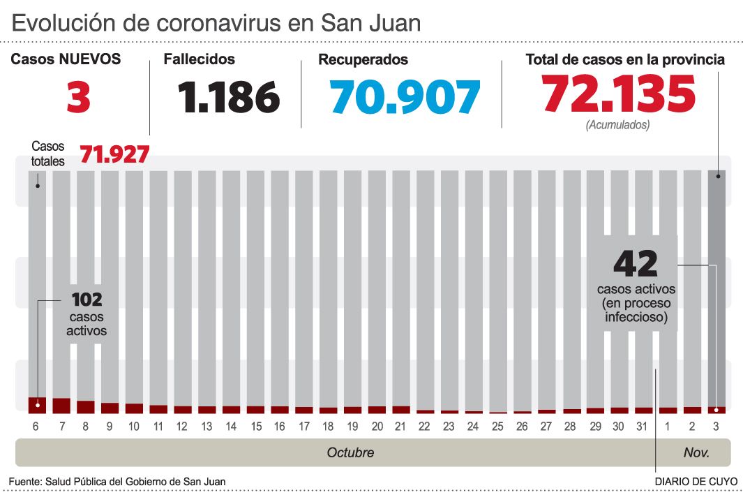 Salud Pública informó ayer que fueron detectados sólo 3 casos positivos, luego de 340 test; a la vez que no hubo decesos. De esta manera, el acumulado tiene 72.135 infectados. Hay, en tanto, 42 personas con proceso infeccioso y 40 internados.