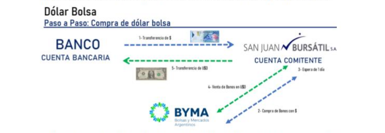 A modo de ejemplo, si una persona humana o jurídica cuenta con pesos, con la ayuda de un asesor bursátil puede comprar bonos, luego espera 1 día hábil (“parking”) con los bonos en su cuenta comitente. Cumplido el plazo, vende los bonos en su modalidad dólares, y finalmente, puede hacerse de los billetes físicos por medio de una transferencia a su cuenta bancaria.