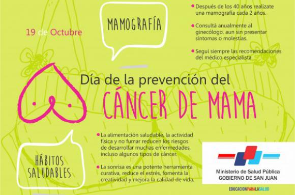 San Juan, 19 de octubre.- Hoy se conmemora el Día Mundial Contra el Cáncer de Mama y, en este contexto, el Ministerio de Salud de la provincia difundió qué medidas se debe tomar para prevenir la enfermedad y tratarla a tiempo.