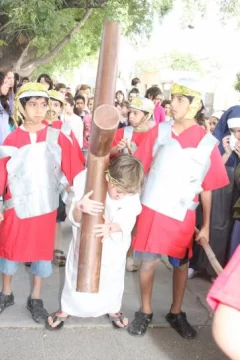 La Cruz parecía aplastar a Santiago Serpa, quien hacía de Jesús ayer. Sus piernas delgadas temblaban: "Qué actorazo", se escuchaba entre los espectadores. Pero la cruz de 2 metros no pesaba más de 4 kilos. Por su parte, el jefe de los romanos, con una barba gruesa que parecía haber gastado un corcho entero, gritaba a sus súbditos "azote, azote", mientras desenfundaba su espada que no disimulaba el cartón.