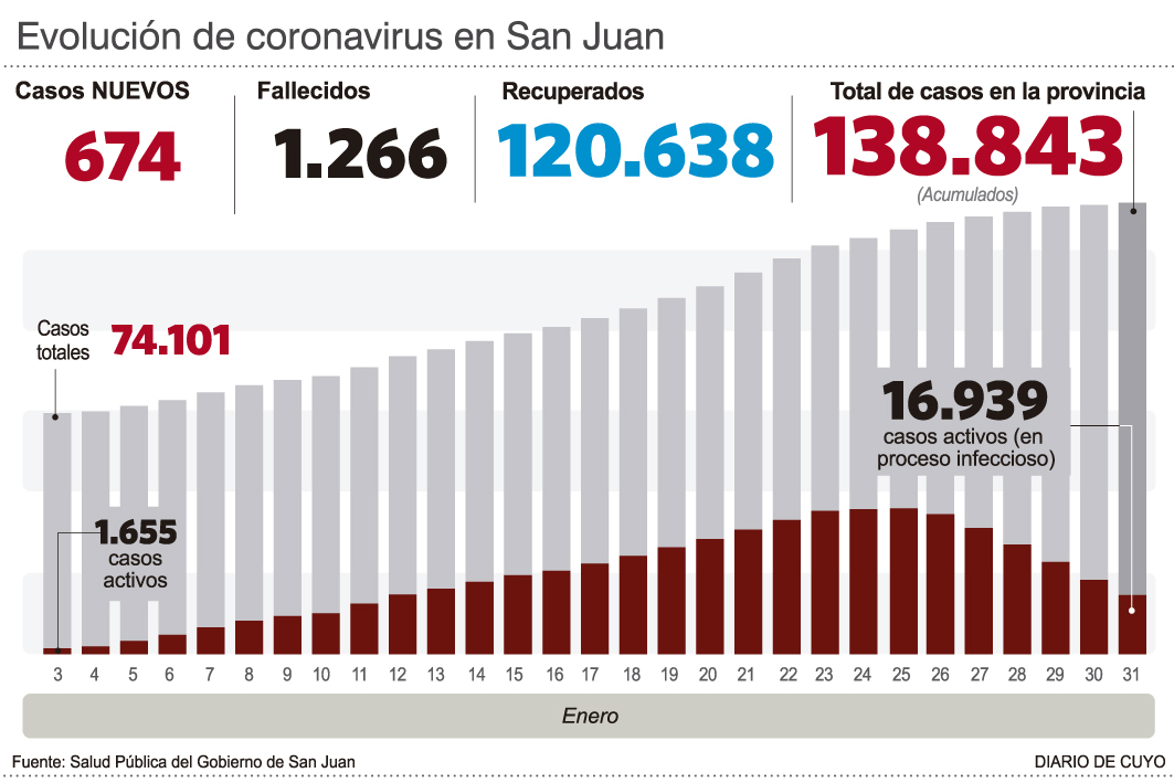 Los datos coinciden con ese panorama. Es que, según la información del Ministerio de Salud, desde que el coronavirus desembarcó en San Juan, hasta diciembre de 2021 la provincia tenía 73.618 positivos detectados, mientras que enero sumó 65.495 casos. Es decir, un 47% del total se contagiaron durante el mes que terminó ayer. Dentro del mes, hubo varios altibajos. Enero comenzó con 1.035 casos y terminó con 674, sin embargo hubo picos muy elevados. Hubo 3 días consecutivos en los que la cantidad de casos superaron los 4.000, y 18 en los que la cantidad de positivos detectados superó los 2.000, cosa que nunca antes había pasado en San Juan. Incluso, en enero San Juan superó la barrera de los 100.000 casos, algo que terminó muy por encima el último día. Y, si bien la cantidad de casos sigue siendo elevada, desde hace días la curva viene marcando un descenso.