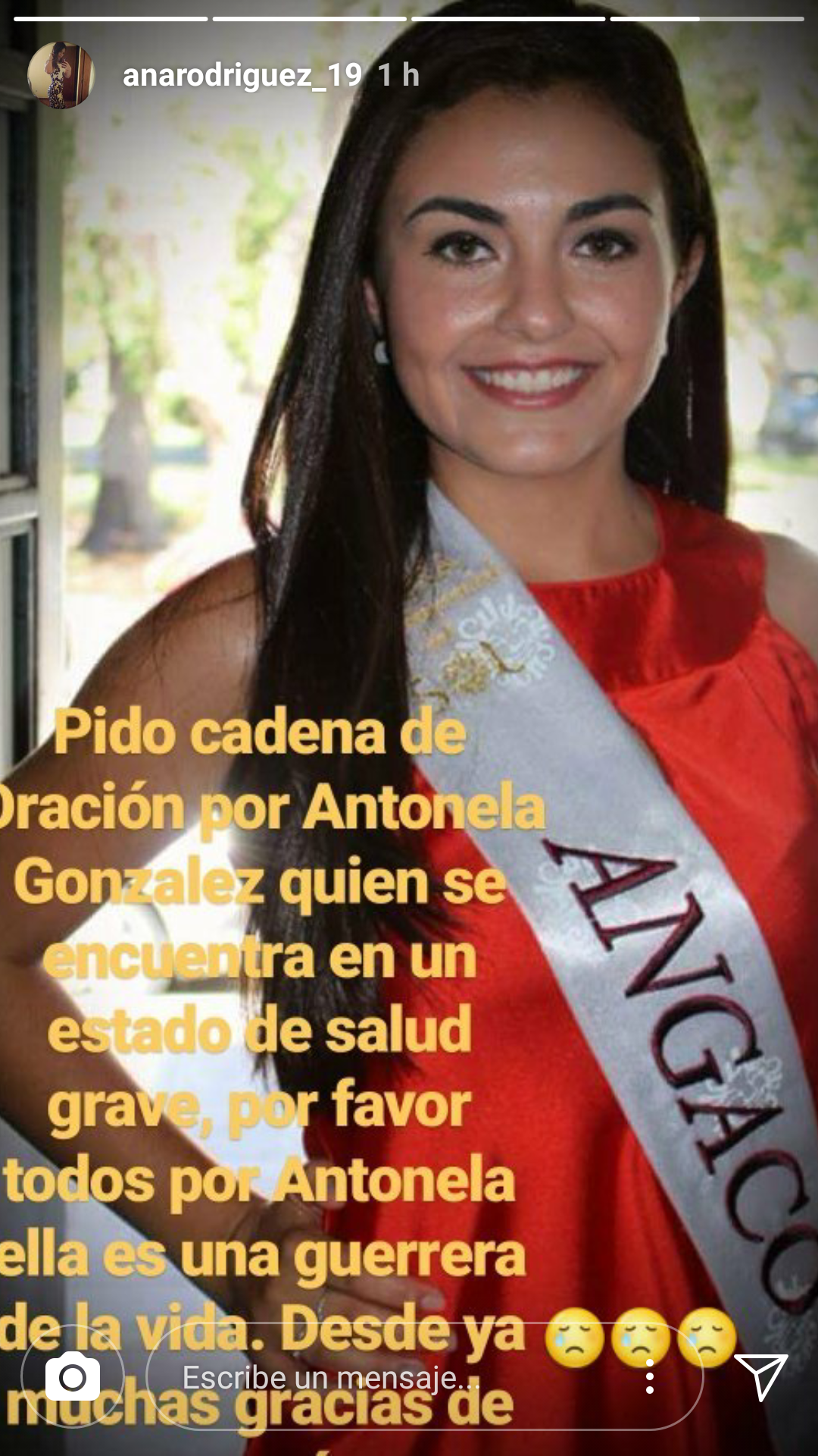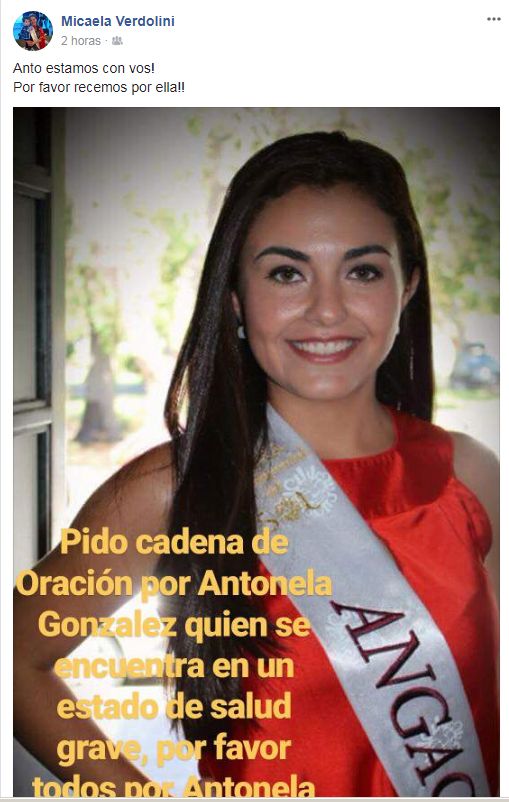No son horas fáciles para Antonela González y su entorno. La vida de la joven que en la edición anterior de la Fiesta Nacional del Sol representó a Angaco corre peligro luego de sufrir este miércoles un Accidente Cerebro Vascular.