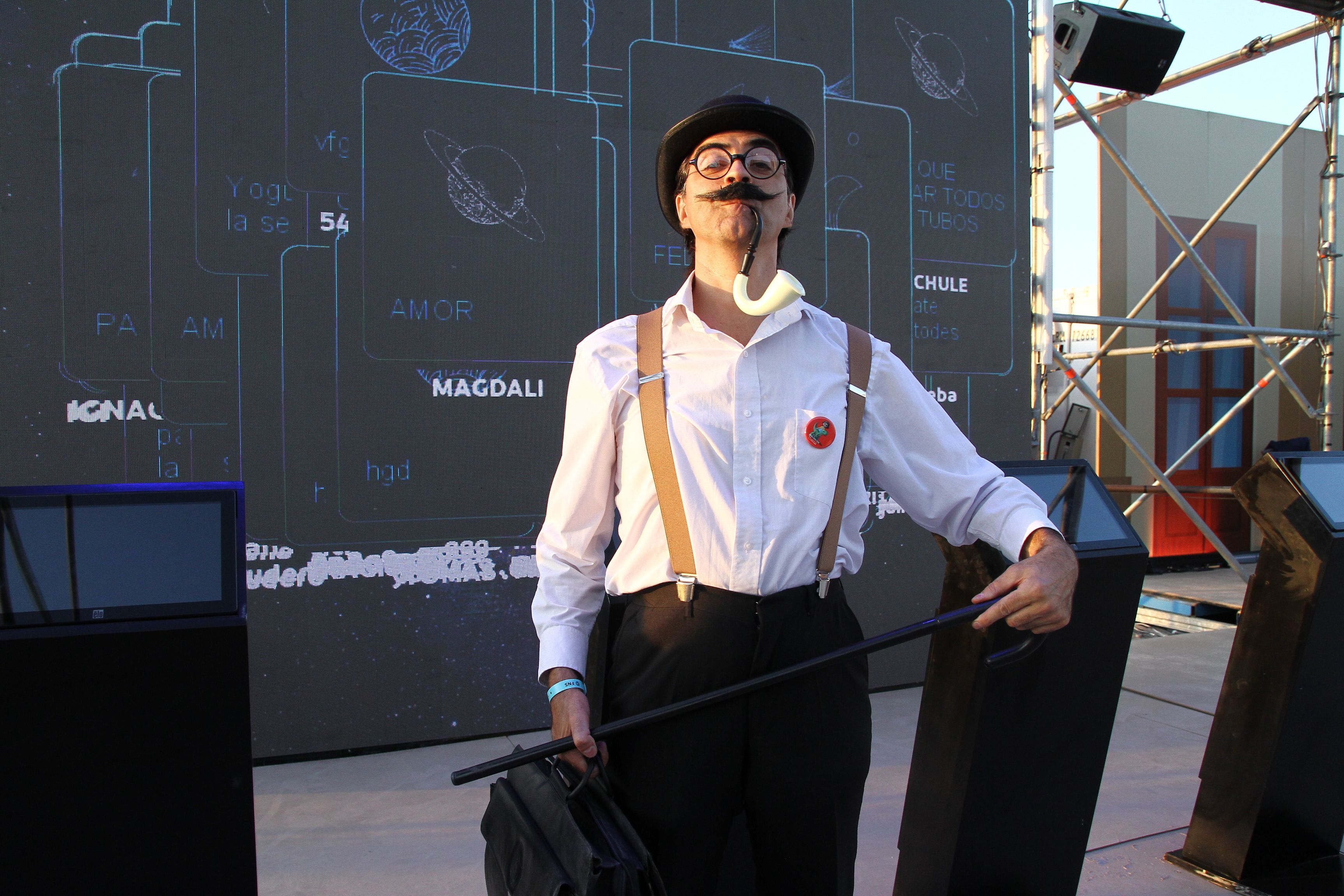 "El Filósofo" (nombre artístico de este personaje, encarnado por actores que van rotando) llama la atención de quienes recorren el predio. Con un look muy particular y obsequiando algunos suvenires de la Fiesta Nacional del Sol, este personaje invita al público a cerrar una gran aventura dentro del stand del Gobierno de San Juan, que propone un viaje en el tiempo para conocer la evolución de la provincia. "Invito a que la gente participe de un juego virtual y que mande un deseo al futuro, con el objetivo de que se cumpla. Soy como un nexo", dijo.
