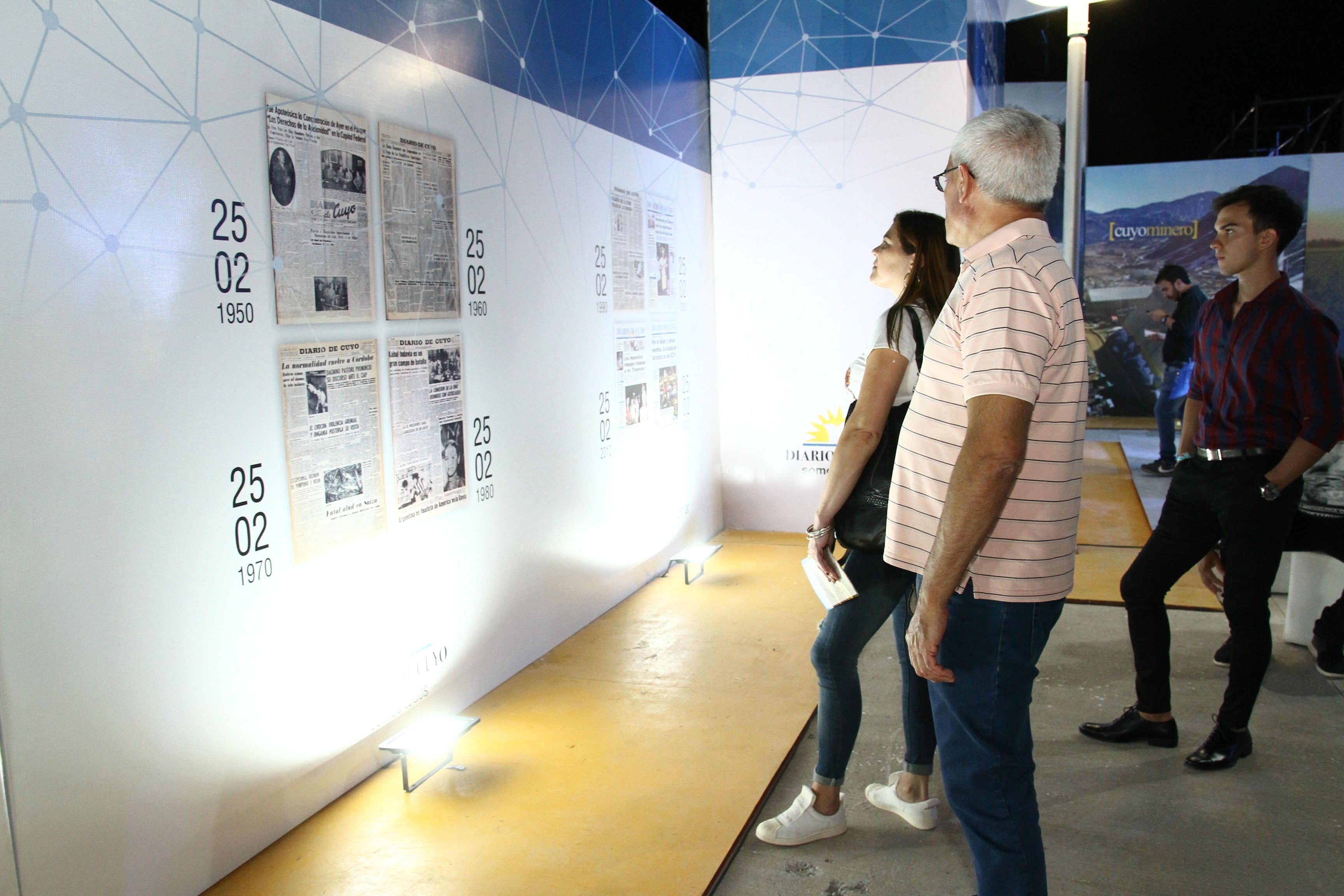 El stand de este medio. Las portadas de DIARIO DE CUYO de diferentes décadas llamaron la atención del público, en el stand de este medio que está ubicado en uno de los accesos al predio. Ahí se realizan transmisiones en vivo y entrevistas, además de sorteos y shows todas las noches.