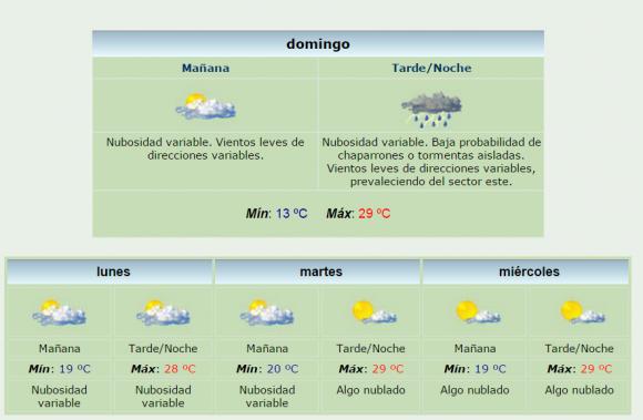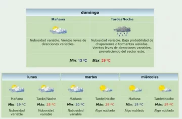El clima se espera que se mantenga en el inicio de la semana ya que mañana la temperatura llegará a los 28 grados en la máxima y rondará los 19 en la mínima. Mientras que para el martes la máxima será de 29 grados y la mínima de 20.