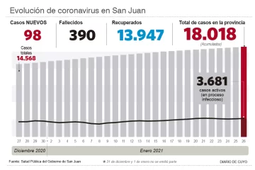 Por otro lado, con los contagios del martes se superó la barrera de los 18 mil casos de Covid-19 en San Juan desde el inicio de la pandemia: hasta ayer ya eran 18.018 acumulados. Pero de ellos, según los datos oficiales, el 77,4% (13.947 pacientes) ya se recuperó de la infección.