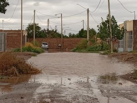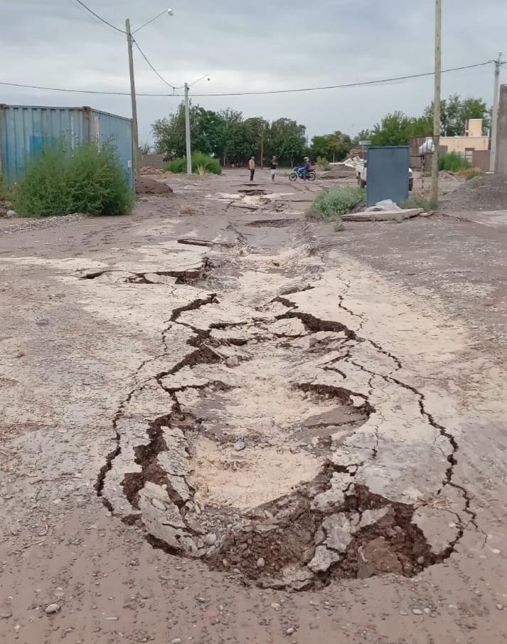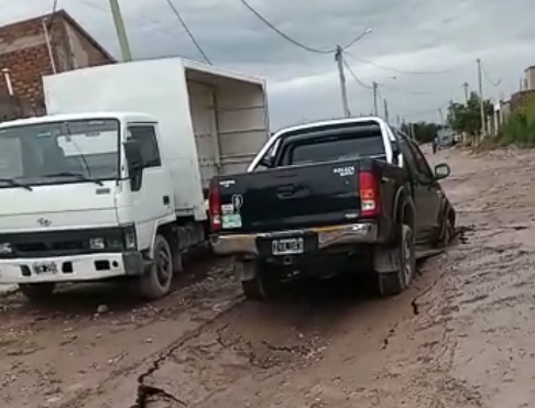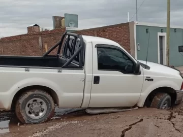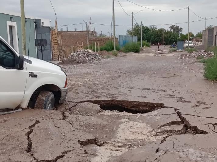 Los vecinos de un barrio de Rawson amanecieron esta mañana, después de la intensa tormenta de la madrugada, con las calles de tierra colapsadas y con pozos sobre la obra de cloacas que aún no fueron estrenadas. Por las roturas, dos camionetas se hundieron.