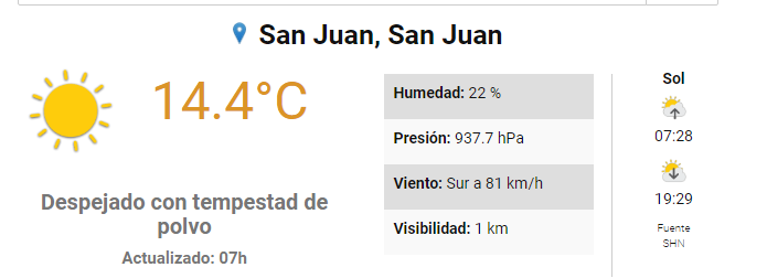 Minutos antes de las 6 llegaron las primeras ráfagas de viento Sur a San Juan, que rápidamente comenzaron a aumentar en velocidad. De ese modo, a las 7 de la mañana, el viento corría a 81 kilómetros por hora y la visibilidad estaba reducida a un kilómetro.