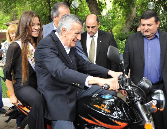 Una vez que les entregaron el cheque, el gobernador José Luis Gioja y las soberanas salieron al patio de la Casa de Gobierno en donde el máximo mandatario le entregó el Chevrolet Celta 0 km a la reina jachallera y la moto Maverick 150cc nueva a la representante de 25 de Mayo. El Gobernador aprovechó un momento a que se distrajeran los custodios y se subió a la moto junto a la Virreina para darse una vuelta por los jardines de la Casa de Gobierno y así poder estrenar la máquina que se lleva a su casa Marcela González. Algo que también hizo el año pasado, cuando se subió a la moto de la exvirreina.